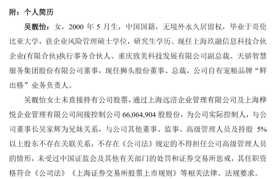 简历露出,吴靓怡出身于2000年5月,毕业于哥伦比亚大学,获企业风险管束硕士学位,究诘生学历。当今,吴靓怡担任上海玖融信息科技结伙企业(有限结伙)实行事务结伙东谈主、重庆致好意思科技发展有限公司副总裁、天骄贤慧作事集团董事,狮头股份自有宠粮品牌“鲜出格”业务负责东谈主。