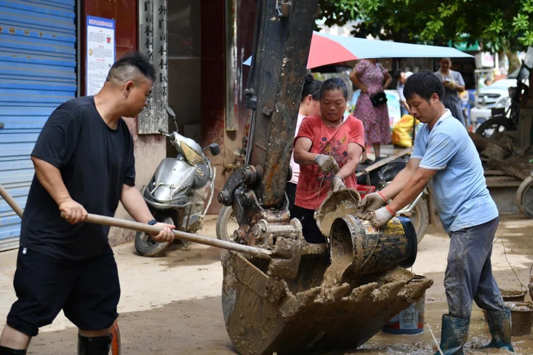 8月1日,在资兴市州门司镇州门司村,村民在算帐淤泥和垃圾。新华社记者 陈振海 摄