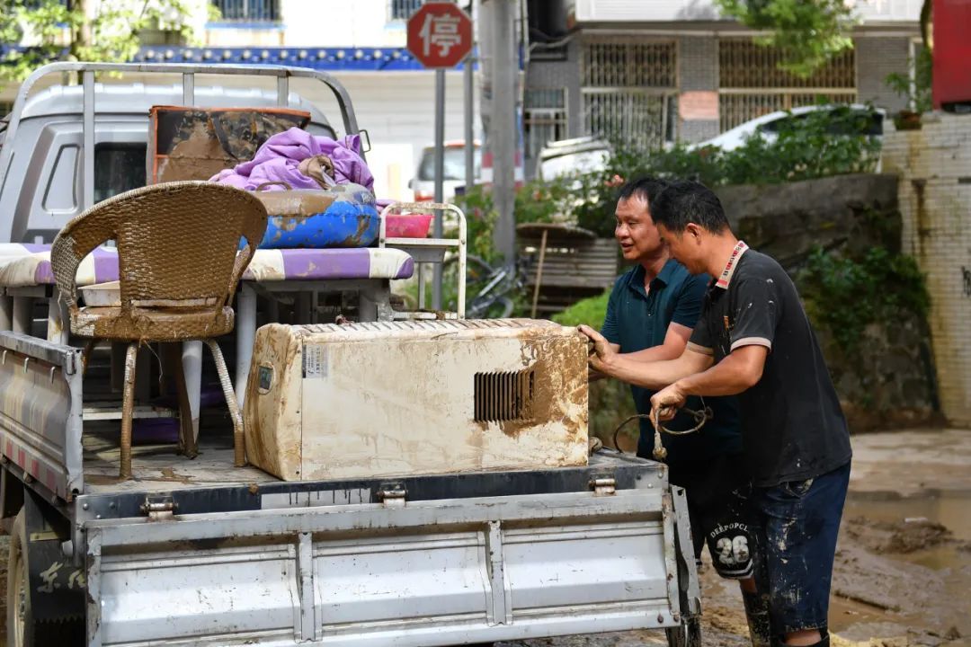 8月1日,在资兴市州门司镇州门司村,村民将受损物品装车。新华社记者 陈振海 摄