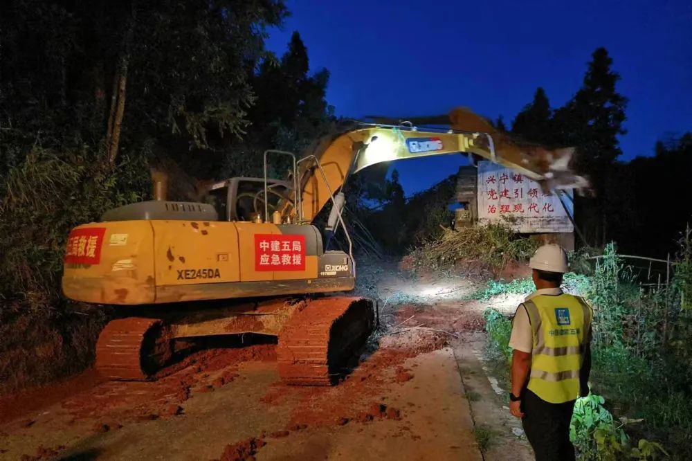 7月30日,在资兴市兴宁镇长坌村209乡说念淤堵路段,中建五局救急补救队在抢修说念路。新华社发(李佳豪 摄)